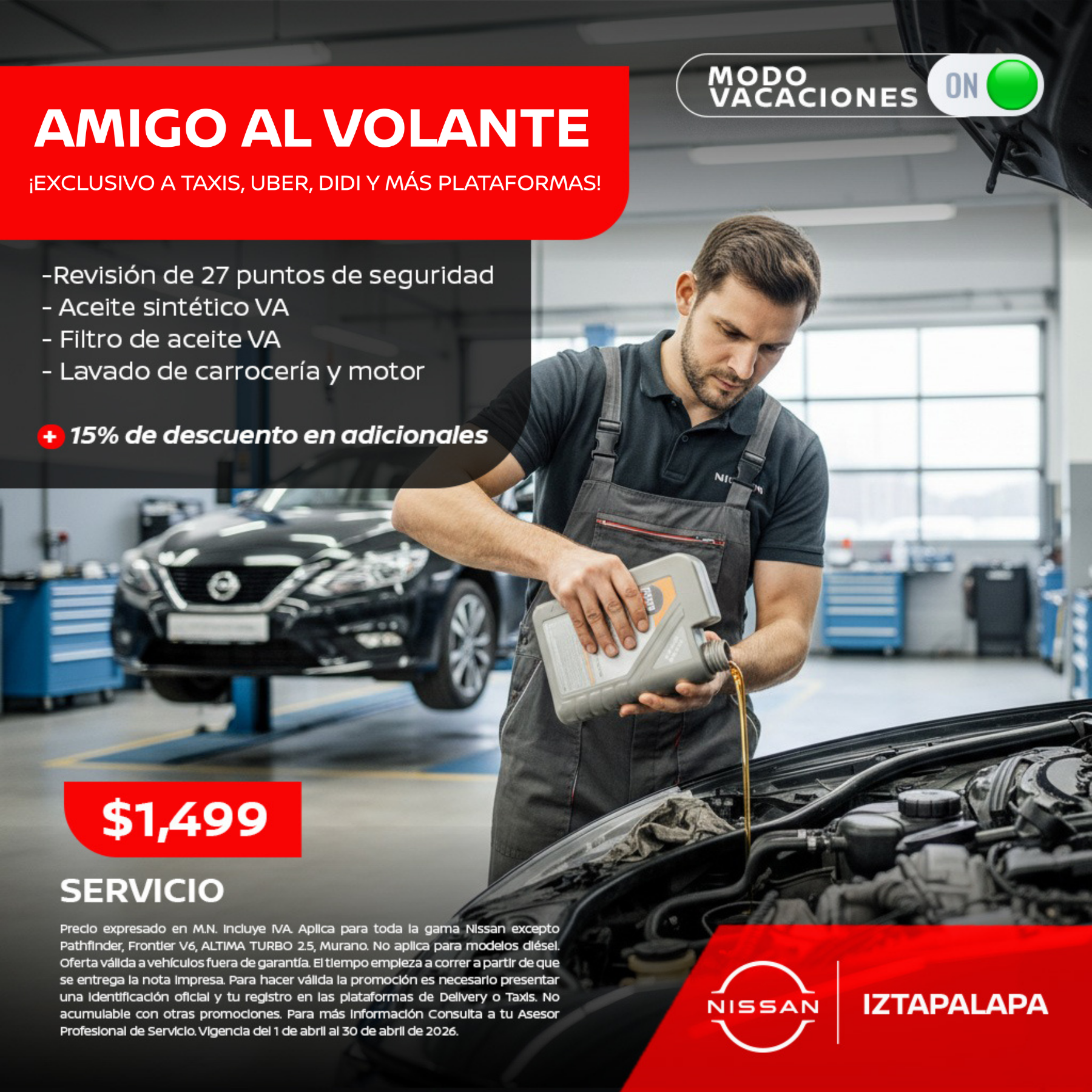 Precio expresado en M.N. Incluye IVA. Aplica para toda la gama Nissan excepto Pathfinder, Frontier V6, ALTIMA TURBO 2.5, Murano. No aplica para modelos diésel. Oferta válida a vehículos fuera de garantía. El tiempo empieza a correr a partir de que se entrega la nota impresa. Para hacer válida la promoción es necesario presentar una identificación oficial y tu registro en las plataformas de Delivery o Taxis. No acumulable con otras promociones. Para más información Consulta a tu Asesor Profesional de Servicio. Vigencia del 1 de abril al 30 de abril de 2026.