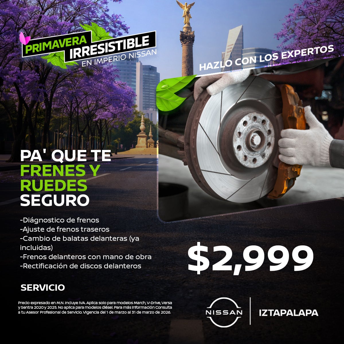 Precio expresado en M.N. Incluye IVA. Aplica solo para modelos March, V-Drive, Versa y Sentra 2020 y 2025. No aplica para modelos diésel. Para más información Consulta a tu Asesor Profesional de Servicio. Vigencia del 1 de marzo al 31 de marzo de 2026.