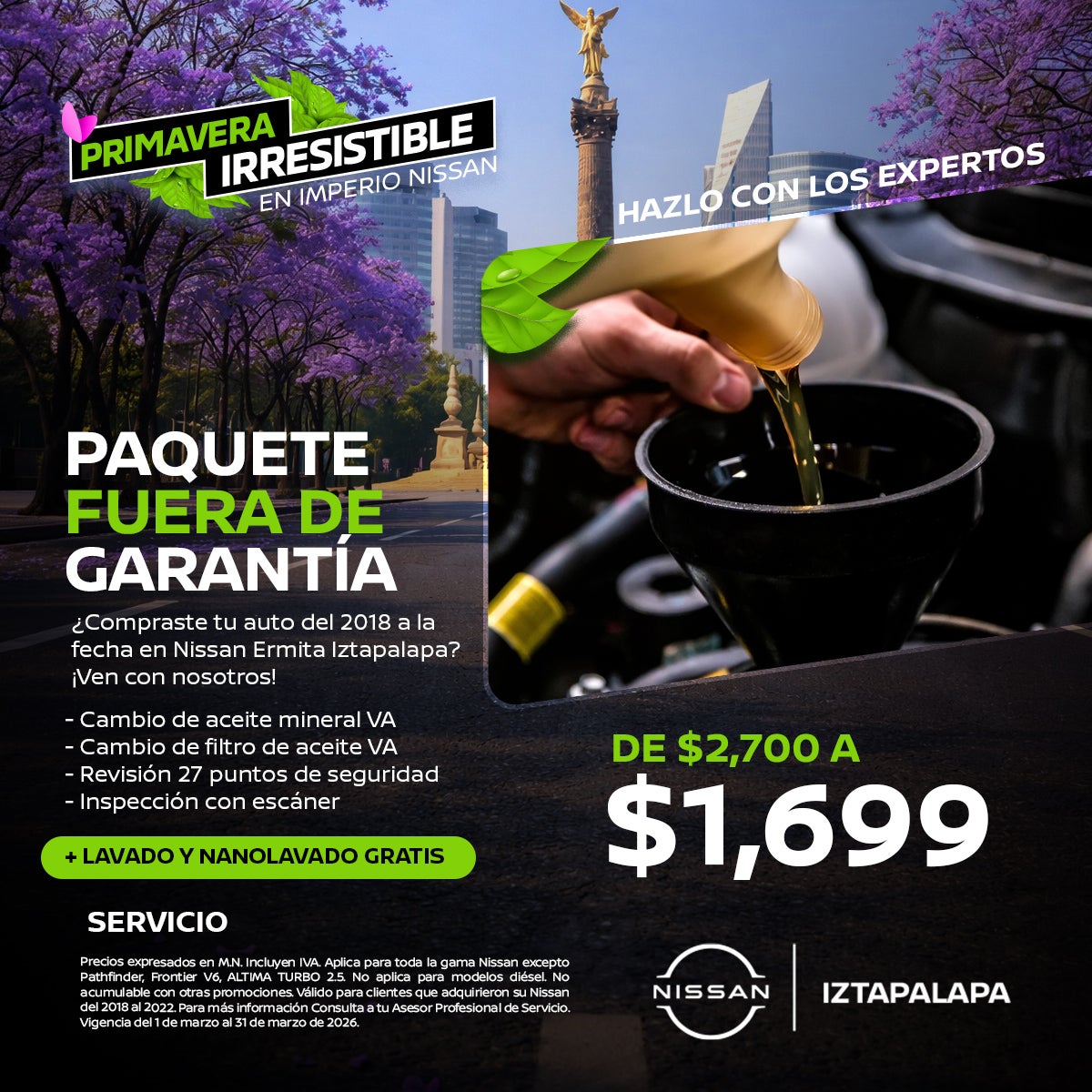 Precios expresados en M.N. Incluyen IVA. Aplica para toda la gama Nissan excepto Pathfinder, Frontier V6, ALTIMA TURBO 2.5. No aplica para modelos diésel. No acumulable con otras promociones. Válido para clientes que adquirieron su Nissan del 2018 al 2022. Para más información Consulta a tu Asesor Profesional de Servicio. Vigencia del 1 de marzo al 31 de marzo de 2026.